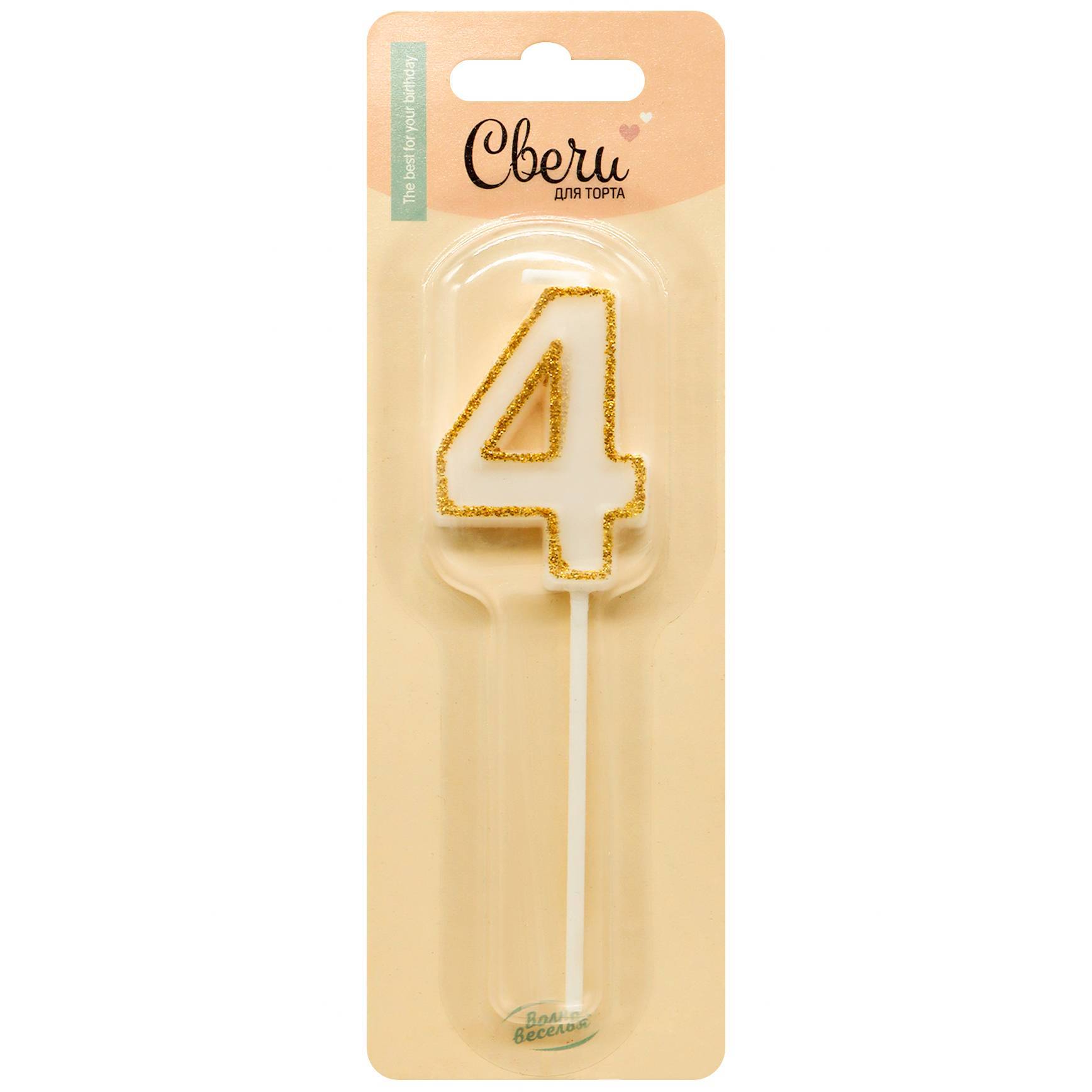 Свеча Цифра, 4 Золотой кант, на шпажке, Белый, с блестками, 4,5*5 + 7 см, 1 шт. с держат.