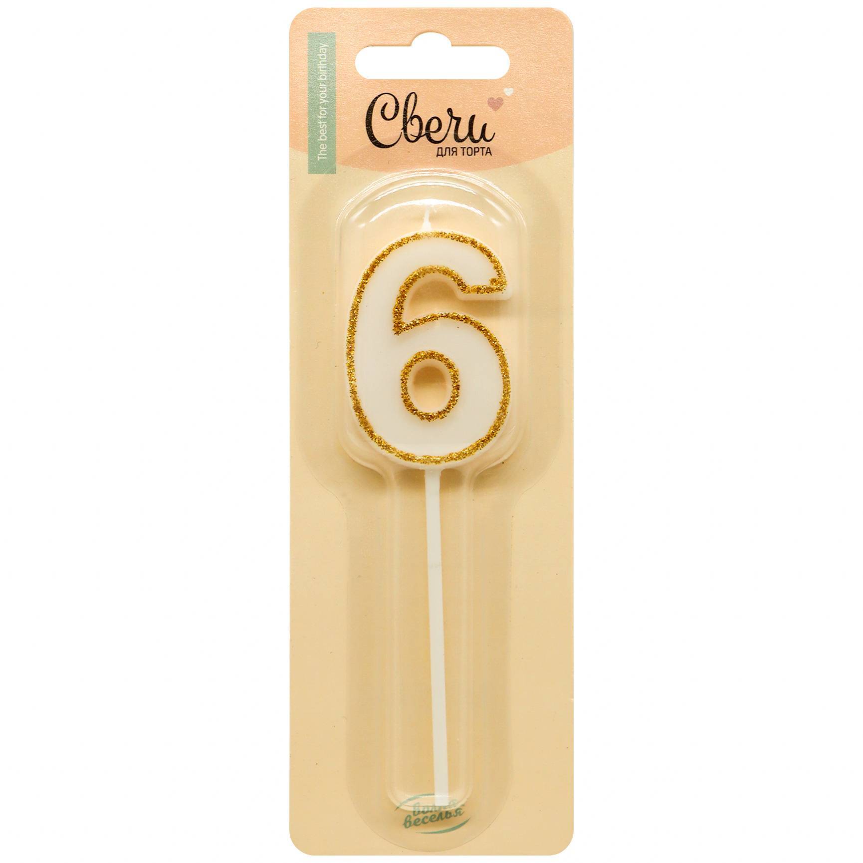 Свеча Цифра, 6 Золотой кант, на шпажке, Белый, с блестками, 4,5*5 + 7 см, 1 шт. с держат.