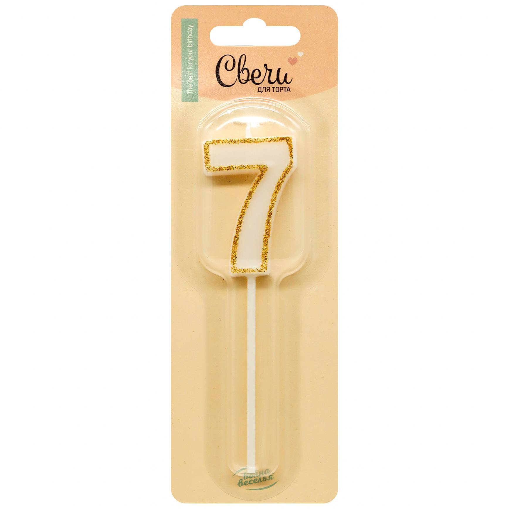 Свеча Цифра, 7 Золотой кант, на шпажке, Белый, с блестками, 4,5*5 + 7 см, 1 шт. с держат.