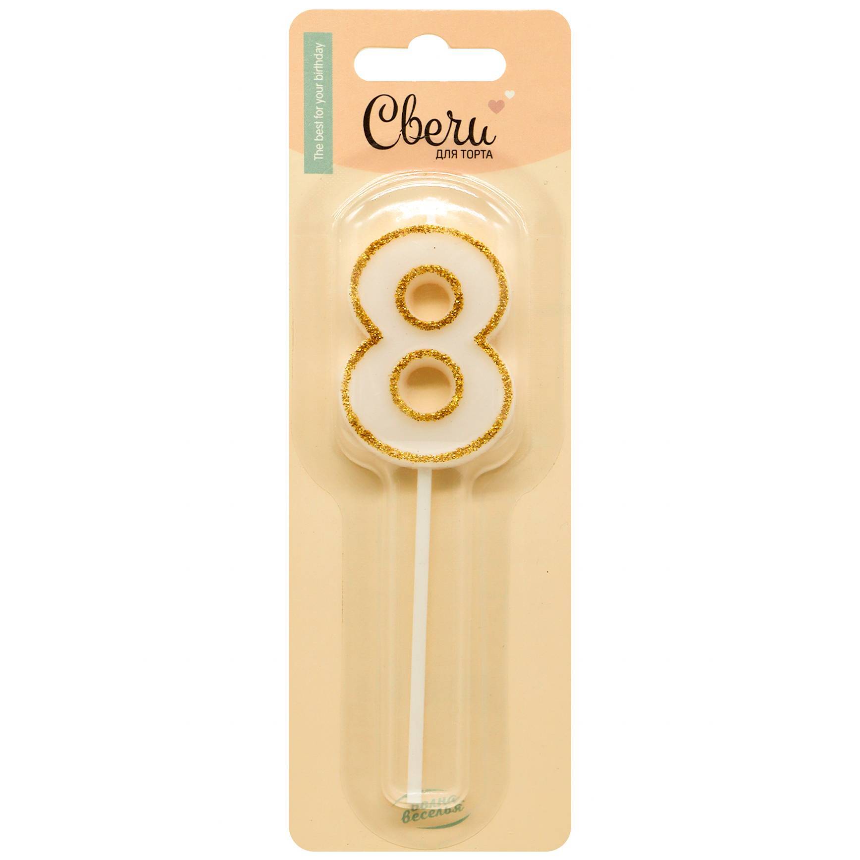 Свеча Цифра, 8 Золотой кант, на шпажке, Белый, с блестками, 4,5*5 + 7 см, 1 шт. с держат.